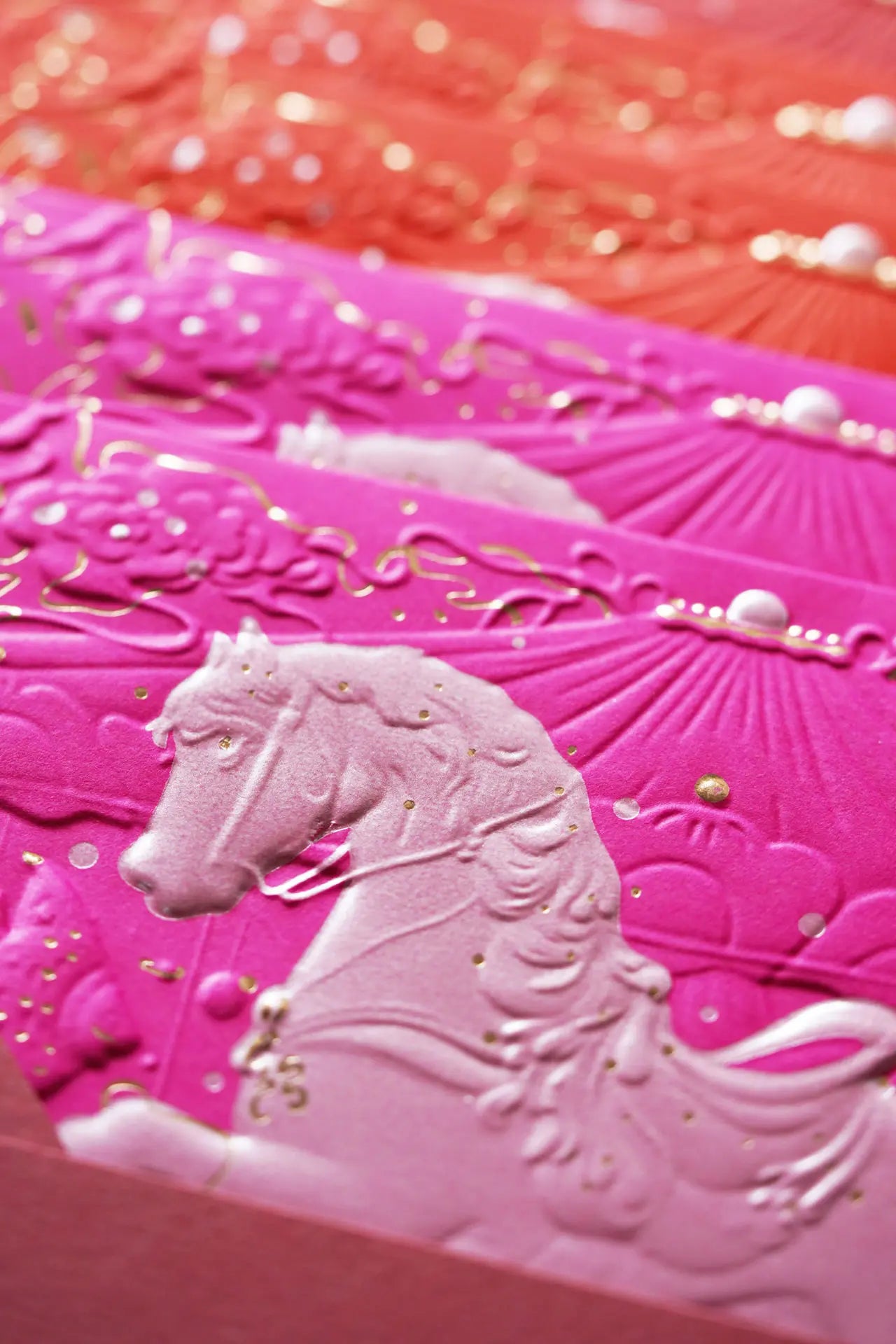 At its centre, a rearing horse emerges through multi-level 3D embossing, symbolising drive, endurance, and forward movement. Flowing cloud motifs and radiant lines frame the composition, accented with pearl foil highlights and gold foil detailing that catch the light with restraint and elegance.
